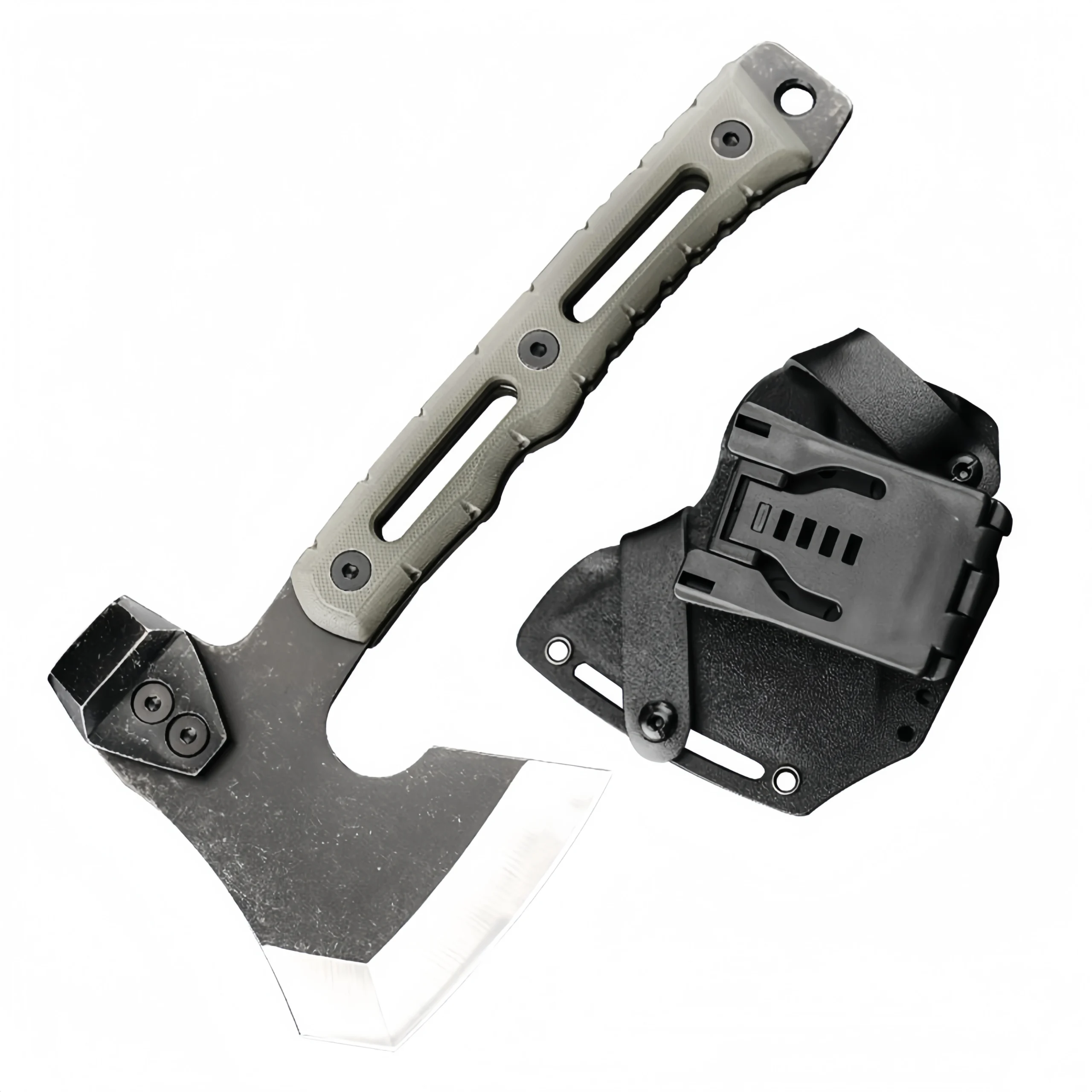The blade is made from 440C stainless steel with a hardness of 58HRC, treated with a titanium-coated sandblasting finish for excellent wear resistance and corrosion protection. The handle is made from G10 material, providing a good grip. Additionally, the axe features a hammerhead and pry bar function, increasing its versatility for various tasks.